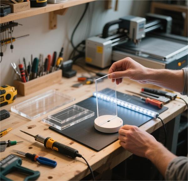 Desde una perspectiva de elaboración, el acrílico sobresale en la trabajabilidad. Se corta limpiamente con herramientas manuales y eléctricas, acepta grabado maravillosamente y se puede moldear con calor. El material también se une bien con varios adhesivos, lo que permite juntas fuertes, casi invisibles, en la base de la lámpara terminada.